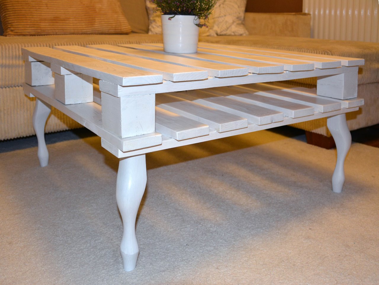 Modny i praktyczny stolik inspirowany paletą w nowoczesnym designie w kolorze białym. Bez blatu.