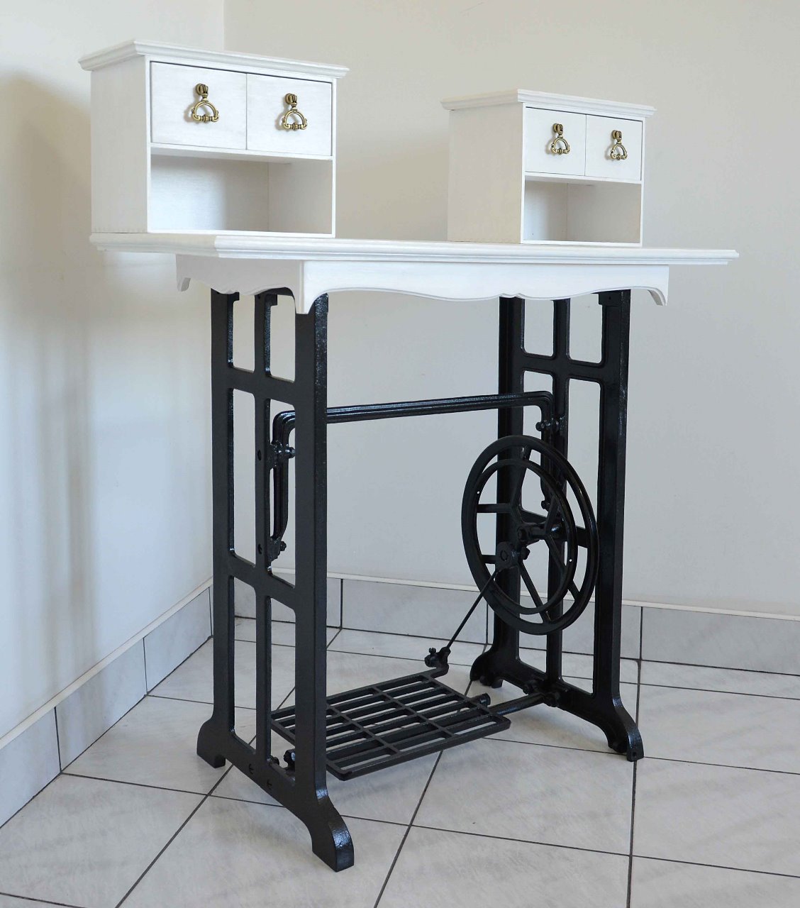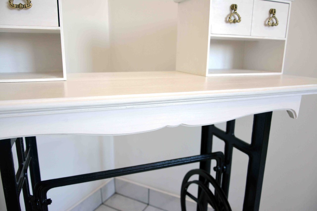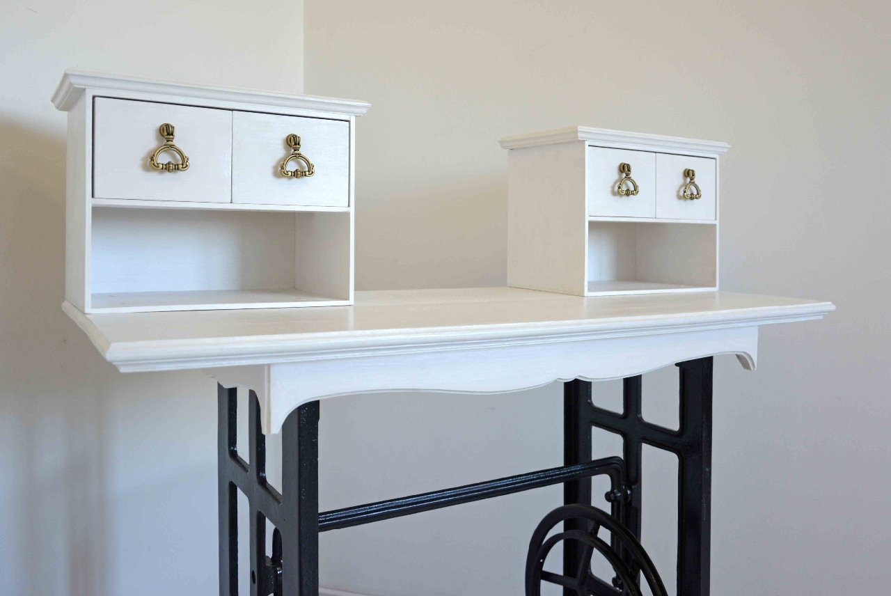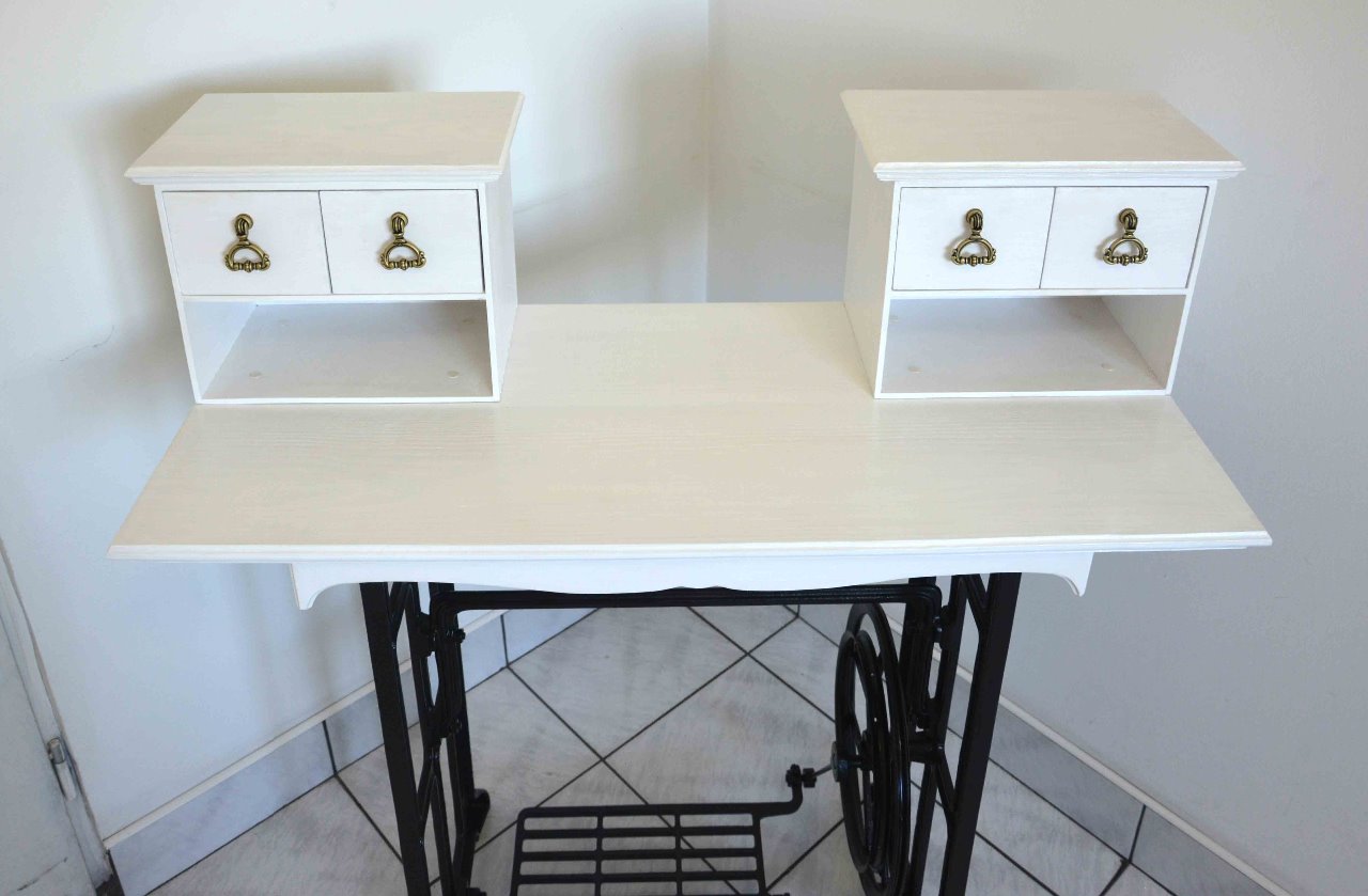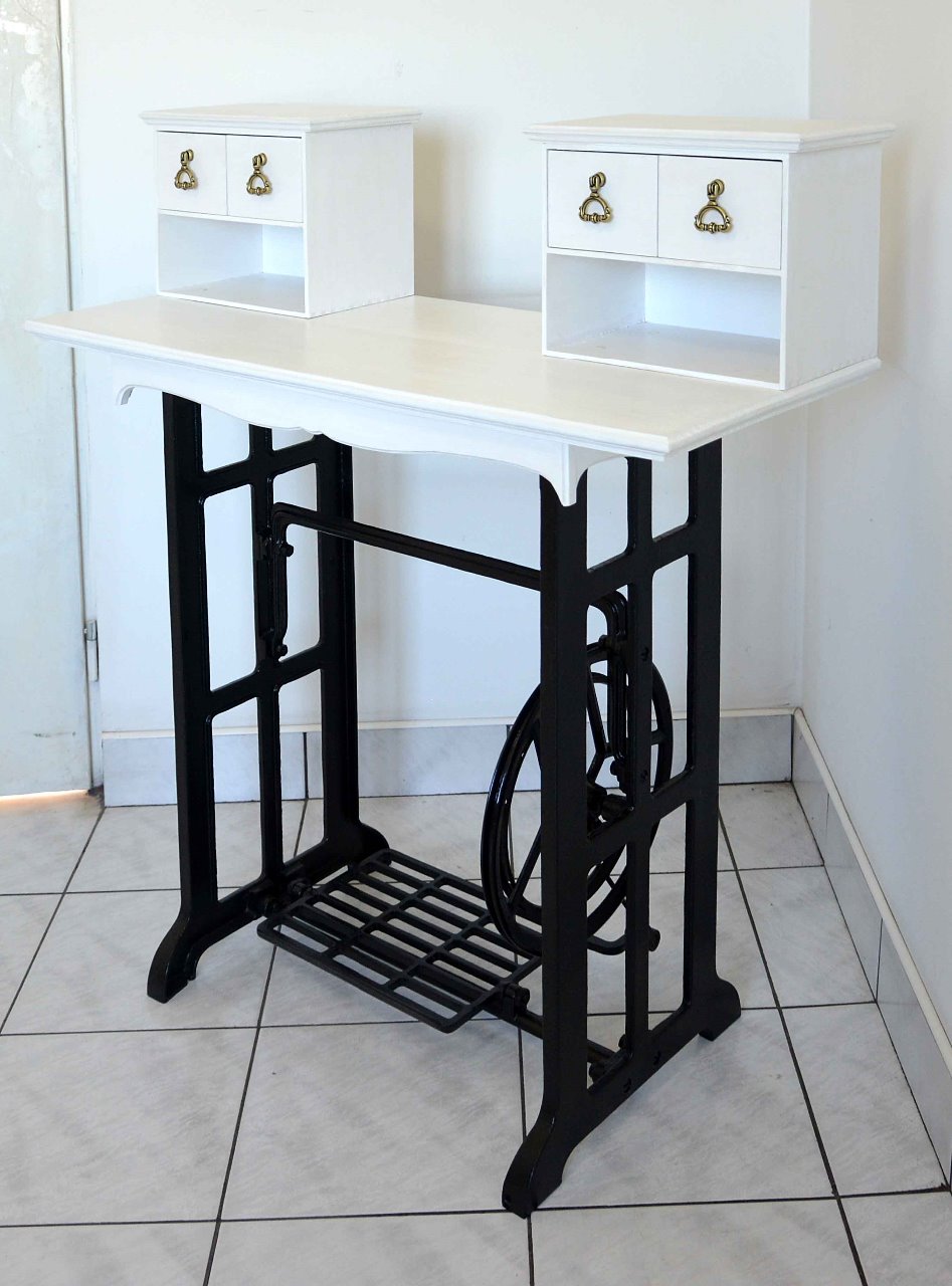 Wyjątkowa toaletka, sekretarzyk wykonana z drewna zaprojektowana na nogach od maszyny Ludwik. Mebel znakomicie łączy elegancję z funkcjonalnością. Oryginalny i unikatowy design doskonale wpasuje się w klasycznie jak również nowocześnie zaprojektowane wnętrza. Doskonały dla tych, którzy cenią sobie niebanalną stylistykę. Delikatne frezy, uchwyty w kolorze starego mosiądzu nadają meblowi niepowtarzalny charakter. Kolor biało czarny. Cztery szufladki. Mebel nowy, wykonany bardzo starannie, z dbałością o każdy szczegół.