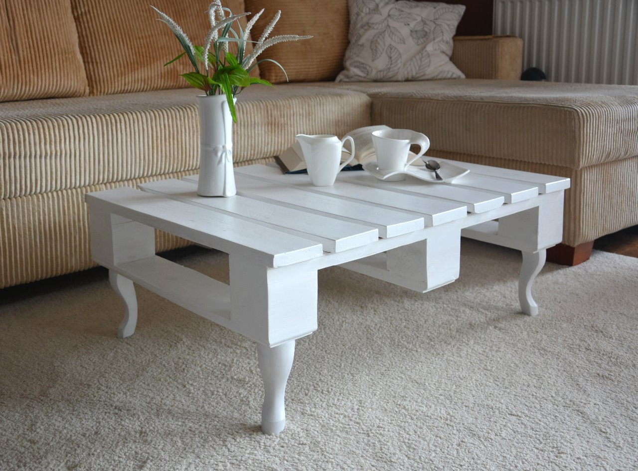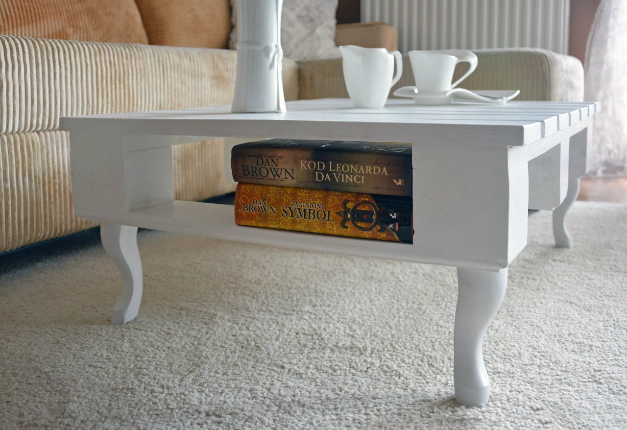Ręcznie wykonywany wyjątkowy stolik kawowy inspirowany paletą w kolorze białym, wykonany z drewna sosnowego, zaprojektowany na nóżkach bukowych w stylu ludwik. Mebel dokładnie wyszlifowany, pokryty dwoma warstwami specjalnej farby do drewna białej matowej i dodatkowo warstwą lakieru. Wszystkie wykorzystane materiały są ekologiczne. Całość bardzo starannie wykonana. Pokrywamy stoliki również impregnatem akrylowym, kolor uzyskany tą techniką, jest mniej kryjący bardziej uwidaczniający strukturę drewna.